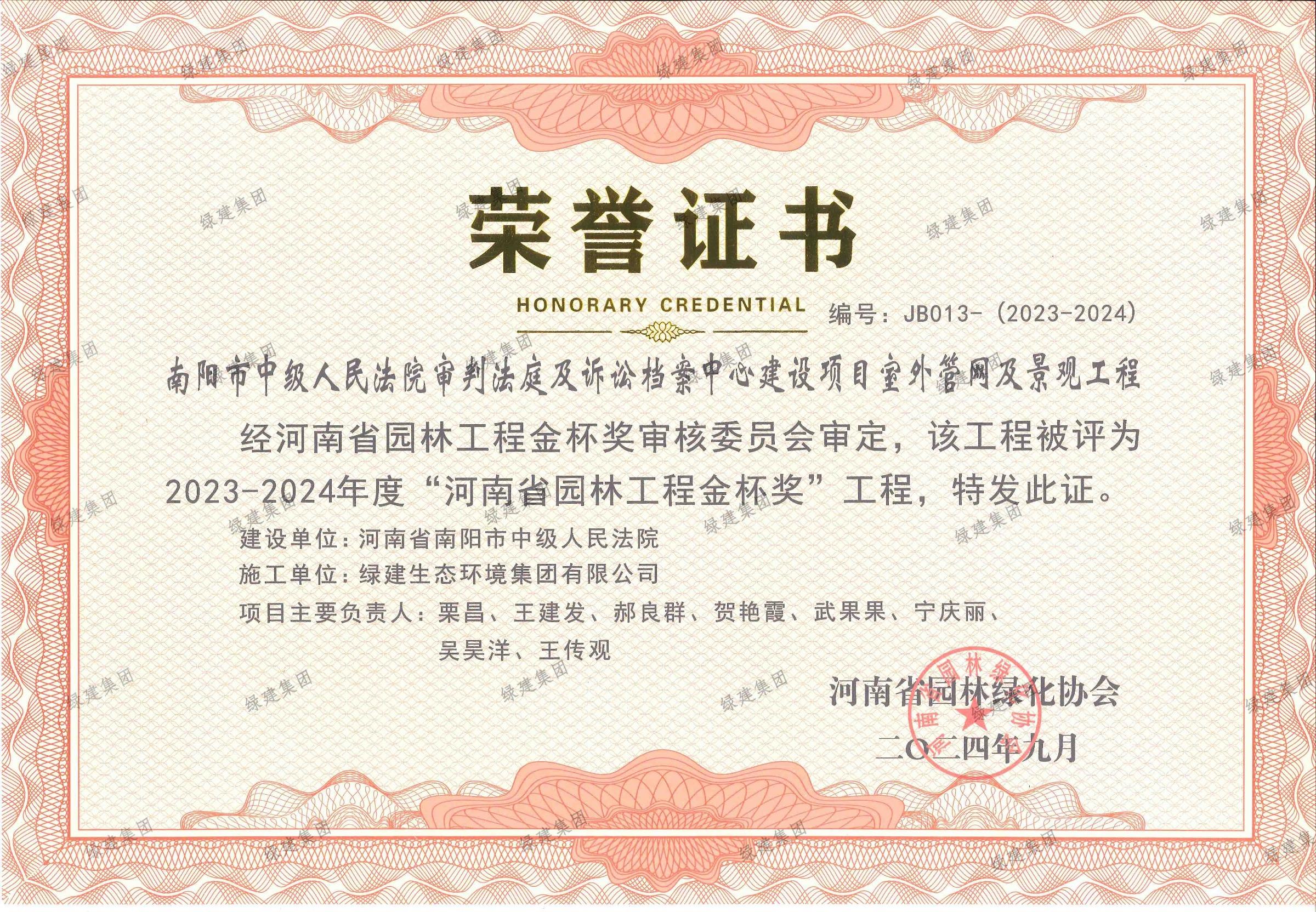 2023-2024年度“河南省園林工程金杯獎”——南陽市中級人民法院審判法庭及訴訟檔案中心建設項目室外管網及景觀工程