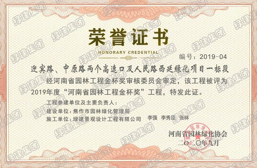 迎賓路、中原路兩個(gè)高速口項(xiàng)目榮獲2019年度河南省園林工程金杯獎(jiǎng)