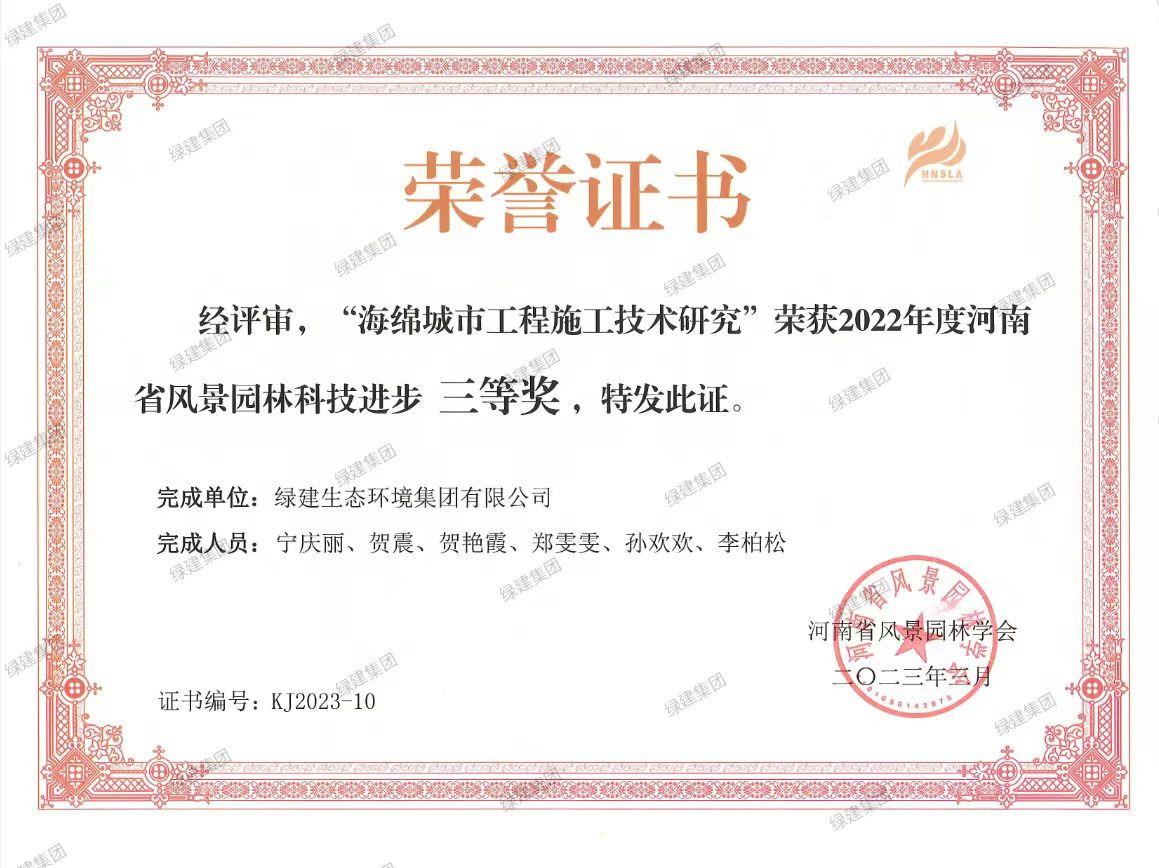 海綿城市工程施工技術(shù)研究榮獲2022年度河南省風景園林科技進步獎三等獎