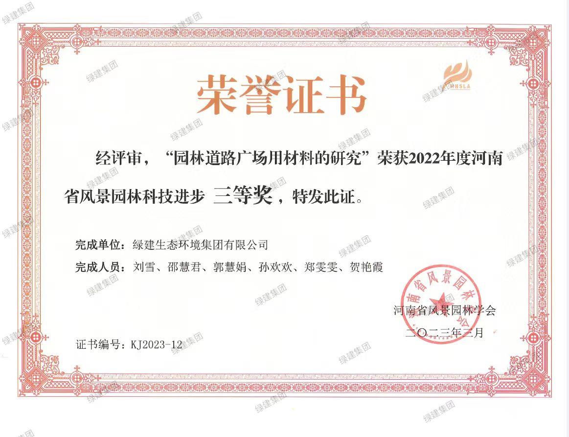 園林道路廣場用材料的研究榮獲2022年度河南省風景園林科技進步獎三等獎